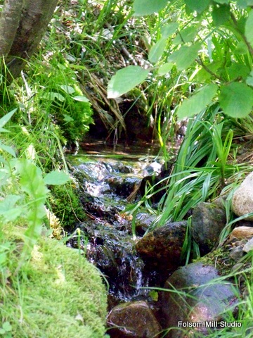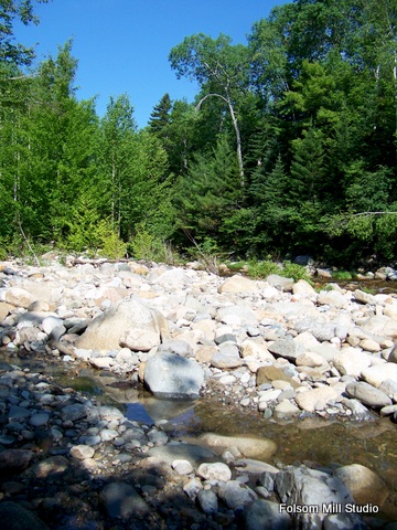 A tiny feeder brook dumps in to this main river. I comes from a mountain stream high above, which has been filled with winter run off(SNOW) I love following these streams up through the woods with a camera and a gold pan.