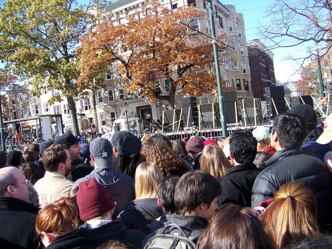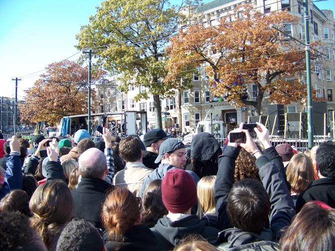 Steven Tyler turns to include all the college student who have gathered along the ground in front of their old place on Comm Ave