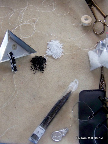 Now with all I think I will need,  piled high upon my blue tray,  I sit at the table over looking the yard and river with my dog and cat close by.  I add the string to my needle,  usually Fireline so the piece will last for years and then I use the needle to pick up one tiny seed bead at a time.  I like using 15’s and 11’s the best.  They are very tiny.  I have to focus or prick myself.
