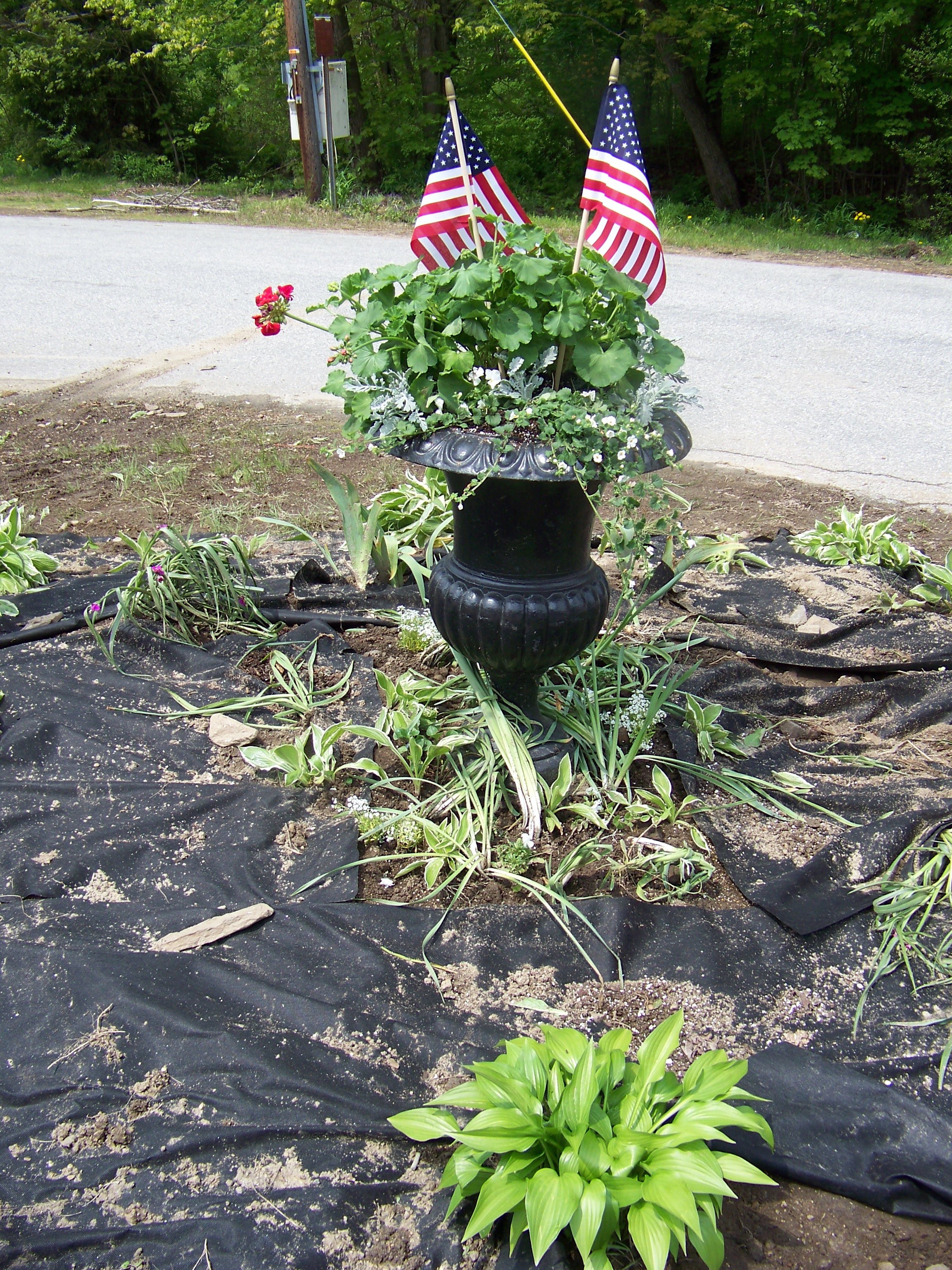 JT and I took 3 half pick up truck loads of mulch I had saved in my yard all winter  and added it to this space.  The parade would be days away and I wanted it to be complete for Memorial Day.