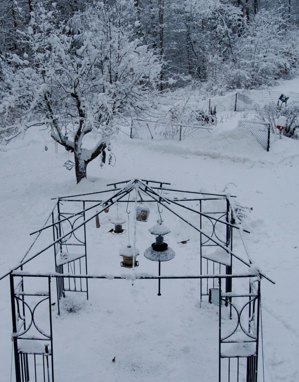 It snowed and snowed and snowed some more. It was a day of pushing snow around the landscape, that had looked so warm the day before. The sun was supposed to show up yesterday and warm up all that wet snow and I knew what that meant. Yes back up onto the roof I would go. He put the heavy ladder up against the lowest roof line and held the ladder while I went up with cameras wrapped up in plastic bags and placed into a canvas bag, I also brought up the electrical wire draped over my good shoulder and prayed I made it to the top of the ladder with no slip ups. Once upon the roof I found out rather quickly how slippery it was and fell hard on my bad knee. Is that not the way when you have an injury?  Now I had to get real close to the edge as he handed me up not one but two shovels, our Christmas gift from Mom the electric Snow Shovel. I plugged the electric cord into the machine still not thinking it was right to run an electrical appliance in heavy wet snow, I dropped the other end down to him and prayed the wiring was safe and that some of my cheap boots had a little rubber in them.  Now with trashed knee and bad thumb on left hand and bad left shoulder I set out to see if I could do this alone while he used the roof rake on the front of the house, as reaching up hurts me more. When he had the whole roof over the kitchen and spare bedroom completed he passed me up this rake as well so I could do the loft bedroom across the way,  while I stood on the flat roof covered by rubber and 8″ of snow. No one wants us up there mostly us but when you have snow build up then rain or more snow is predicted it must come off or fear of a roof collapse is a certainty and insurance may not pay if they say you were negligent in not caring for your home.  Being poor and injured is no excuse. I pay over $400.00 a year to them,  to protect my home from things I can not but a roof and new batteries for fire alarms can be done so far by us. While I was clearing roof with electric machine it went so much faster than with a shovel, that is for sure. I had been dreading this after shoveling heavy wet snow the whole day before as he  cleared the rest of this place with the gas snow thrower.  We were so tired we went to bed early with our achy bodies. Today I had a game to watch so I went up early but it ended up taking me just one hour using this new tool and a shovel and roof rake,  I was surprised. I ended up falling two more time both down on that left knee. I have been walking on ice for two weeks ever so careful with no falls and today there were three. I was praying I would be able to climb the ladder down. Yes I am too old for this so is he but we have no other choice. So as I caught my breath and let my heart slow down I unwrapped the cameras and began to take in the beauty of our winter landscape. It really was pretty with all the snow-covered trees and almost 30 F. No sun was visible for which I was thankful.