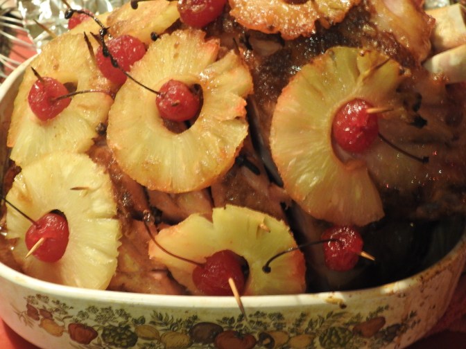 I had taken some fat off the ham then scored it and placed a clove in each crosshatched section then using toothpicks I added the pineapple rings with a stemmed cherry for ease of eating them.