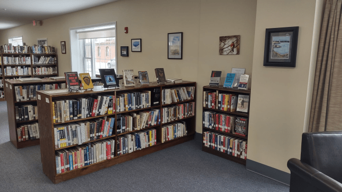 The night of the show these bookcases were topped with unframed art throughout the library it was perfect! Another nod to the staff for all they did to make my art shine.