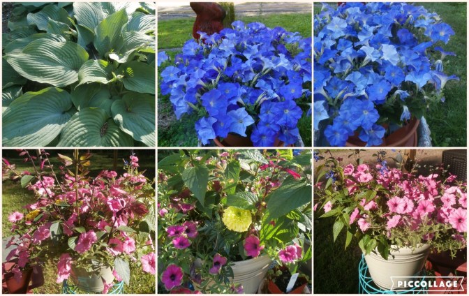 I made a collage of plants with my tiny camera doing all I could to keep it steady. I added tiny 4″ pots of flowers to my larger pots before surgery, also an enormous Hosta I put into a new garden just now in its 2nd year. The Blue/Purple Petunias I won at a local car show in their 50/50 raffle.