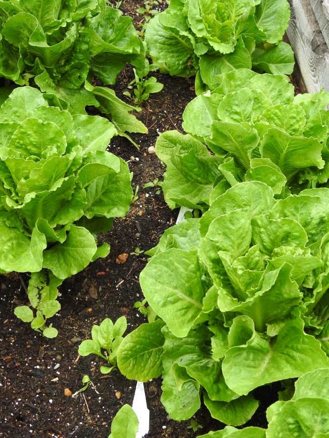 of food, that I actually eat a lot of. I have yellow beans, tomato, cucumbers, lettuce and zucchini in so far and growing nicely considering the weather we have had lately. Garlic scrapes are ready for me to sauté.