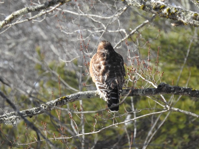 It was just sunning itself on its favorite tree limb. It over looks the river. It also overlooked my backyard gardens where I feed the birds.