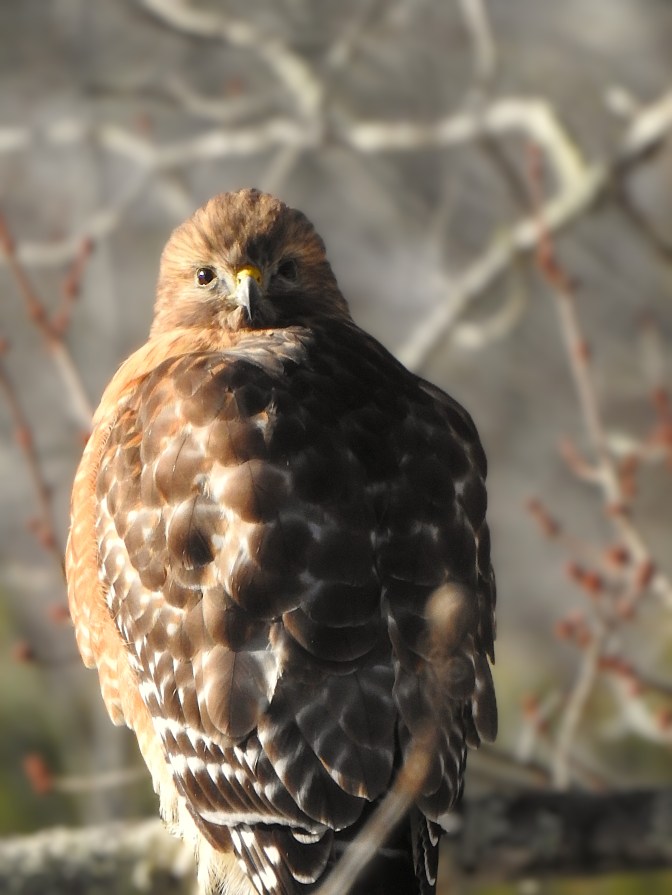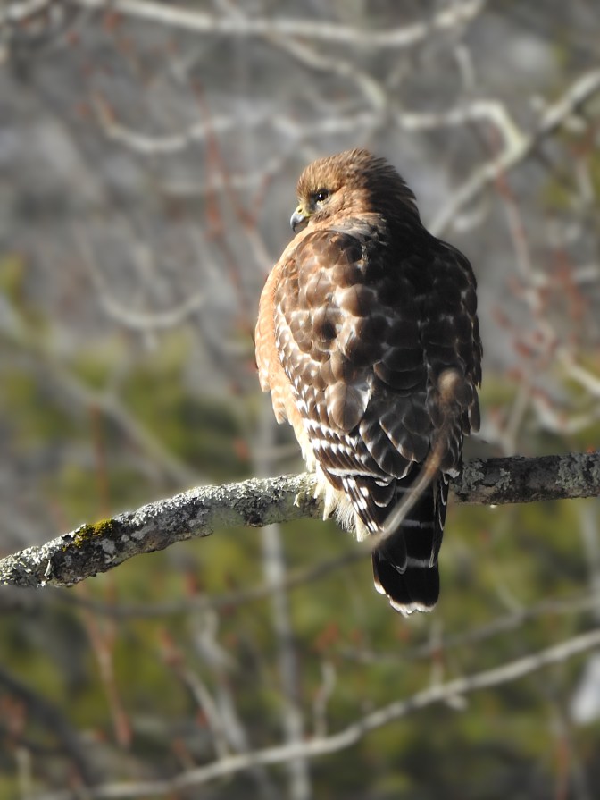 The hawk was just 25 yards from where I parked my car and it never budged from its perch. They do conserve their energy. Only flying when they must, now in the cold weather even more than ever.