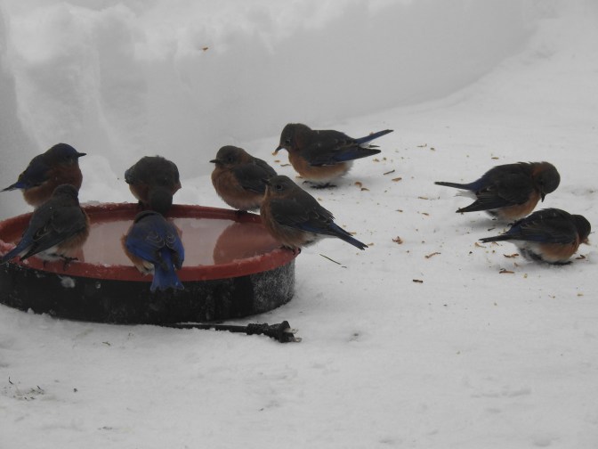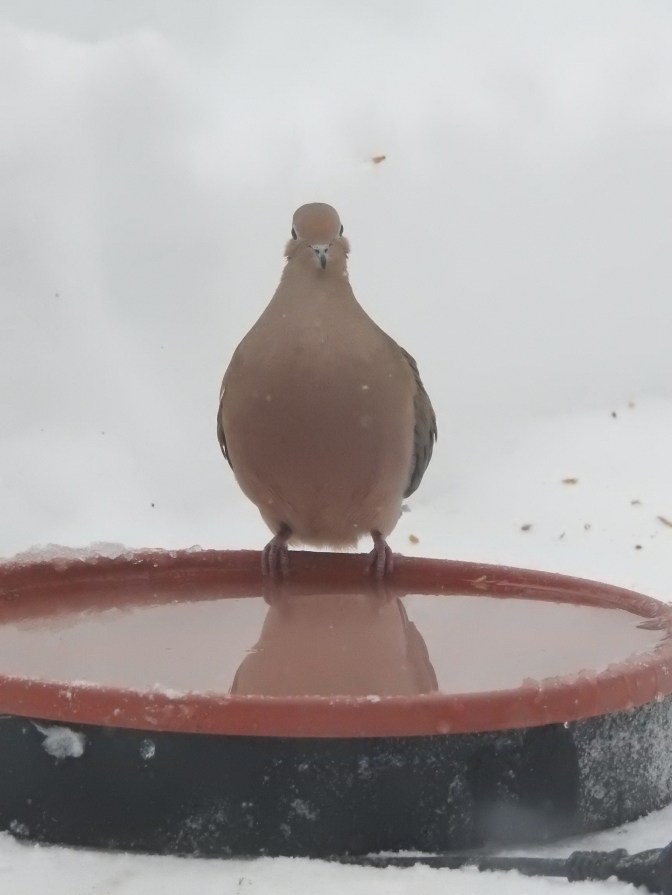I was so busy pushing snow around I forgot about the water dish. Had I plugged it in they would have been bathing in it. I eventually did plug it back in after plowing. The water had already had a bit of slush in it, as it was now just 10 degrees f.