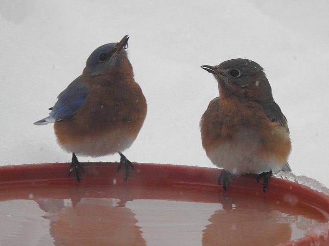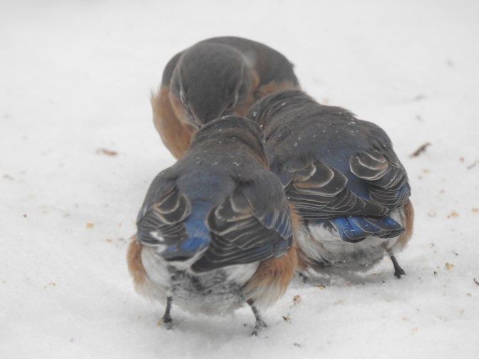 The 3 in the next shot are Eastern Bluebirds. They are all fluffed up, due to the 10 degree day and constant snow.