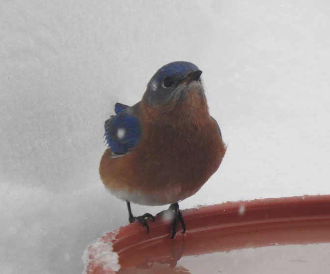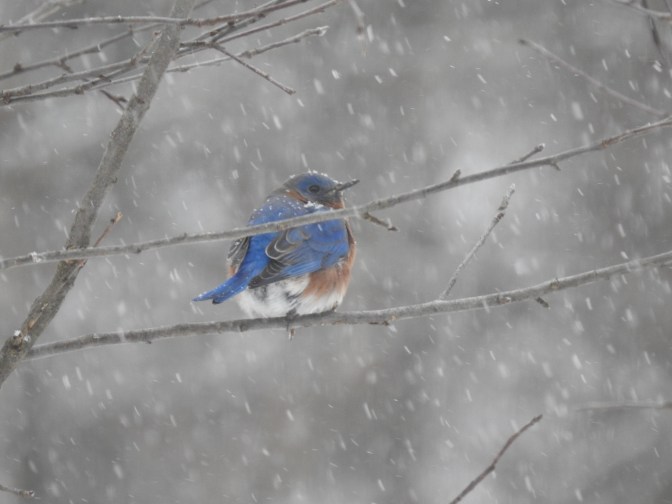 Male Bluebird as he sits quietly as the snow continues to fall.