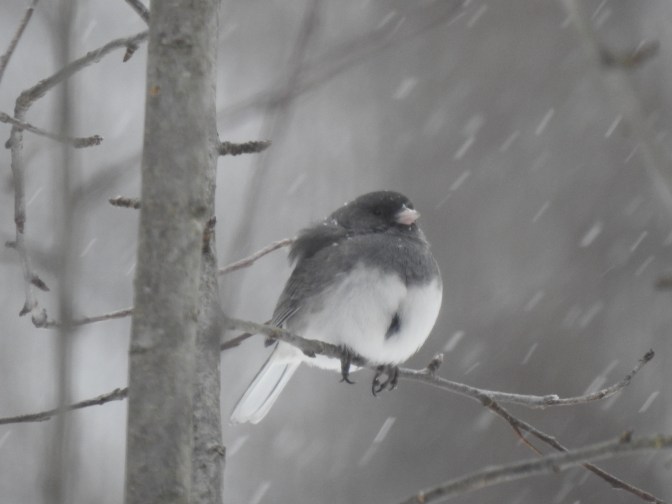 Dark Eyed Junco a regular winter visitor. I would almost guess female from the patch on her belly. Our regular birds who stay in the summers here and raise young have the same spot from sitting on eggs. I think it is called a brood patch.