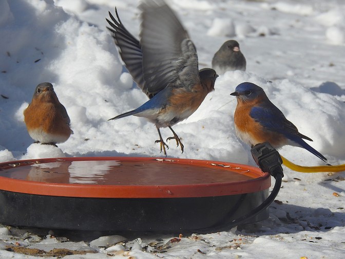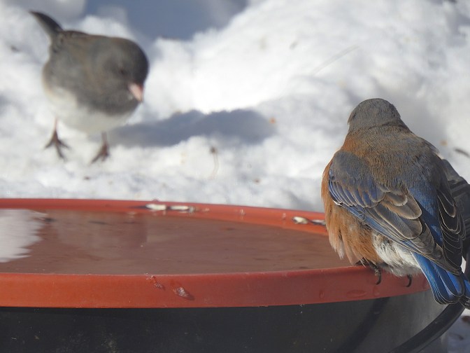 Bluebirds at their sauna. My 11 pound bag of meal worms arrived just in the nick of time. With all the snow and sub 0 temps they need all the help they can get. Are they not beautiful. Bluebirds never used to come up as far as where I am in NH. But, many years of warmer temperatures brought them here.