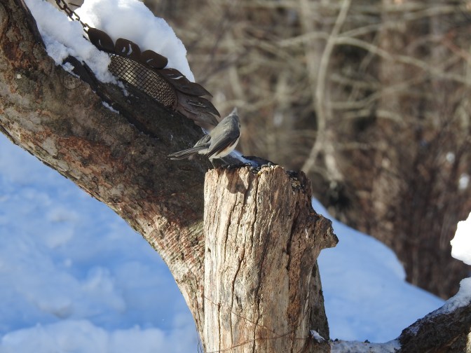 We have been so cold here that the snow has yet to settle yet. My Apple tree continues to rot from within so I use a section to pour birdseed into it. This sharp looking bird is called a Tufted Titmice. It has a beautiful song. It stays all year long with me. So do the Black Capped Chickadees, Northern Cardinals, Blue Jays, and many different types of Finch.
