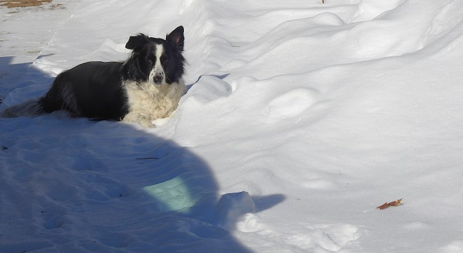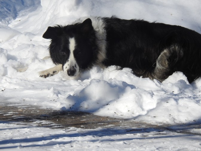 I am not sure why Brady insists on lying in the snow. He doesn’t have a heavy coat as I took it all out this summer when it was so hot. He hate cooling off in water so I raked out his undercoat. Eats fresh power(snow) all day and then rolls or lays in it. He grew up on a beach and we had mild winters. He may have never have seen it before we adopted him. We live just about 17 miles inland.